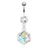 Hier haben wir ein wirklich fantastisches und andersartiges Bauchnabelpiercing, was gar nicht so schön auf den Bildern dargestellt werden kann, wie es in Wirklichkeit aussieht. Der Anhänger dieses Bauchnabelpiercings besteht aus einem schönen würfelartigen Stein, der von vielen kleinen, klaren Steinen umrandet wird. Da es sich hier um einen richtigen Würfel handelt und nicht nur um ein flaches Viereck, hat dieser Anhänger einen wirklich schönen 3D-Effekt.