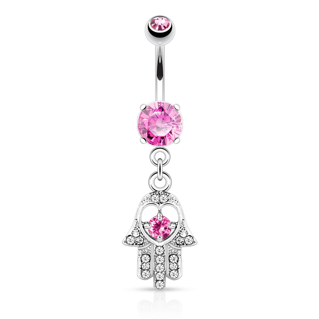 Hier kannst du dir einen richtig schönes Bauchnabelpiercing mit einer Hamsahand im Anhänger aneignen. Die Hamsahand ist ein uraltes Symbol aus dem mittleren Osten, was als schützendes Amulet für den jeweiligen Träger galt. Aus diesem Grund wurde die Hamsahand auch ein sehr beliebtes Schmucksymbol.
