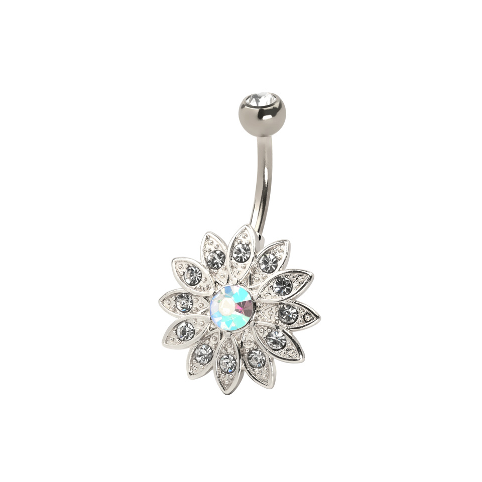 Sag es mit Blumen oder mit einer richtig großen und schönen Blume, die mit Sicherheit für Aufmerksamkeit sorgen wird, wenn du sie in deinem Nabel trägst. Dieses Bauchnabelpiercing aus chirugischen Stahl ist mit einer großen, prachtvollen Blume anstatt einer normalen Kugel ausgestattet. Die Topkugel ist eine blanke 5 mm Kugel mit einem einzelnen kleinen, klaren Stein, der im Kontrast zur großen Blume steht.