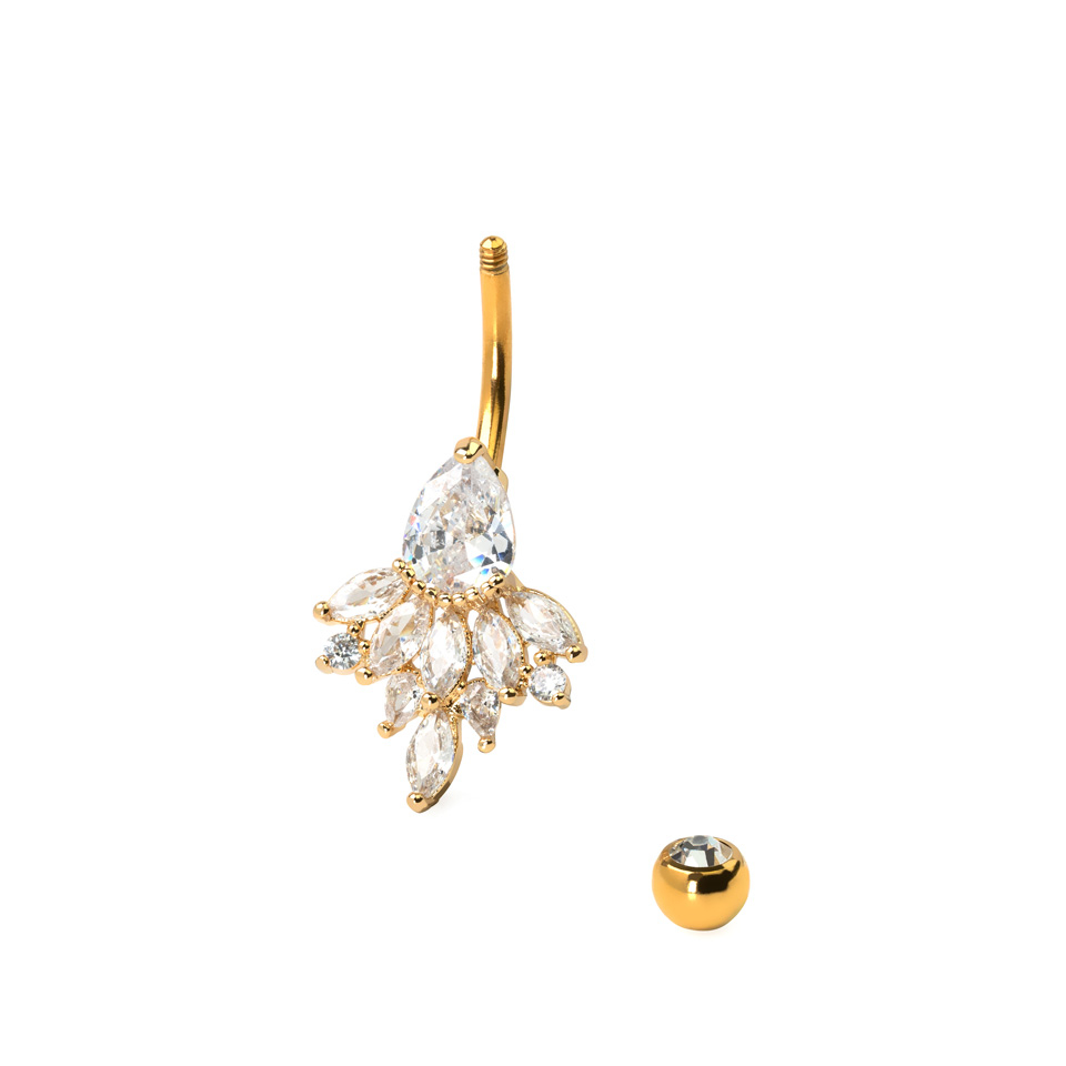 Dieses Bauchnabelpiercing sieht im ersten Moment aus, wie jedes andere Bauchnabelpiercing. Ein gebogener Stab von 10 mm und einer Topkugel mit einem Stein. Aber wenn man genauer hinschaut, sieht man, daß die untere Kugel mit einem großen, tropfenförmigen Stein ersetzt wurde. Unter diesem Tropfen ist eine ganze Gruppe weiterer Steine, die teilweise ebenfalls tropfenförmig und teilweise länglich sind. Genau genommen sind sie marquise-geschliffen. Unter dem Tropfenstein sitzen somit fünf marquise-geschliffene Steine und darunter wiederum vier tropfenförmige Steine. - Immer einer zwischen den länglichen. Dieses extravagante Schmuckstück endet mit einem großen, länglichen Stein.
