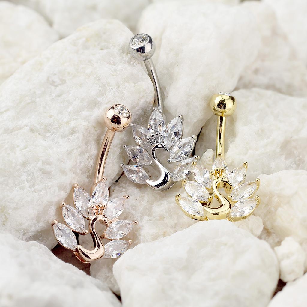Hier bist du auf ein animalisches Bauchnabelpiercing mit einem Pfau gestoßen. Männliche Pfaue schüchtern sich gegenseitig mit ihren langen und fächerartigen Schwanzfedern ein, bei diesem Schmuck werden diese Federn durch marquise geschliffene Steine visualisiert. In der Regel besitzt ein Männchen zwischen 100 und 150 Schwanzfedern, dies als Schmuck zu realisieren wäre wohl etwas zu utopisch gewesen, somit kommt dieser Schmuck mit sieben Schwanzfedern in der Form von Steinen.