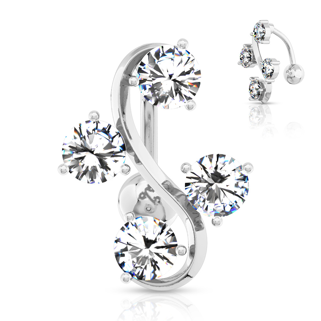 Süßes und freches Bauchnabelpiercing mit vier runden Steinen, die etwas versetzt um ein großes "S" formatiert wurden. Durch die großen Abstände zwischen den Steinen, sieht dieses Nabelpiercing besonders schön aus, da man immer ein wenig deine Haut sehen kann. Dieses Schmuckstück besteht aus dem meist verwendeten Material Chirurgenstahl und gibt damit kein Nickel frei.
