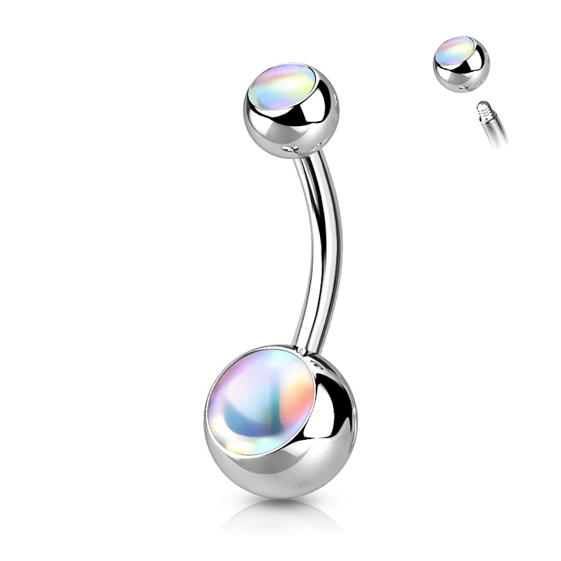 Du kennst es aus Seifenblasen oder wenn du einen Ölteppich auf Wasser siehst. Die hochglänzende Oberfläche, die beim Bewegen des Werkstücks ihre Farbe ändert, ist faszinierend anzusehen. Gleiches gilt für diesen Bauchnabelring. Die Steine in den oberen und unteren Kugeln ändern ihre Farbe wie Benzin auf einer Wasseroberfläche. Da es sich bei dem Bild um ein Standbild handelt, kann der Effekt nicht angezeigt werden. Du musst es persönlich betrachten und von einer Seite zur anderen drehen. Wenn du diesen Bauchring sichtbar im Nabel trägst, ist der Effekt sichtbar, wenn du dich bewegst.