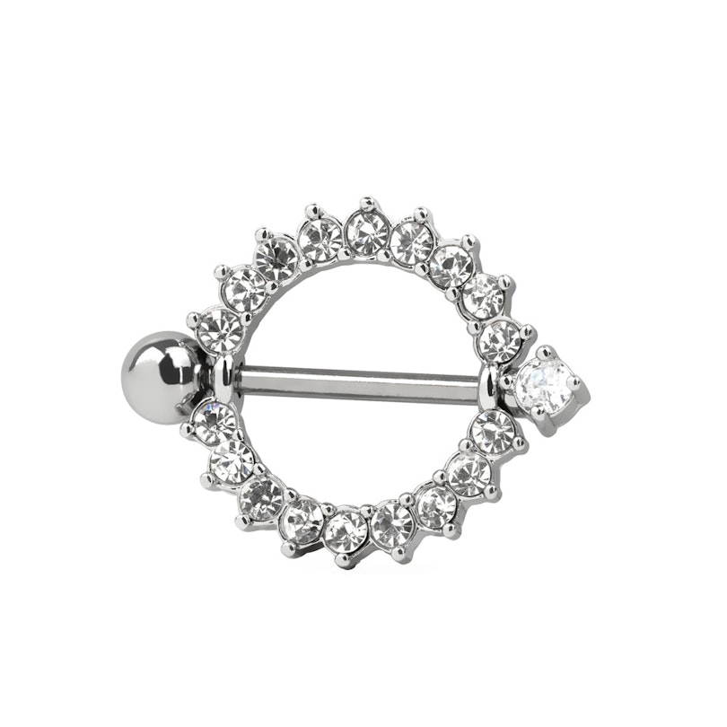 Brustwarzenpiercing mit einem runden Schild und klaren Steinen
