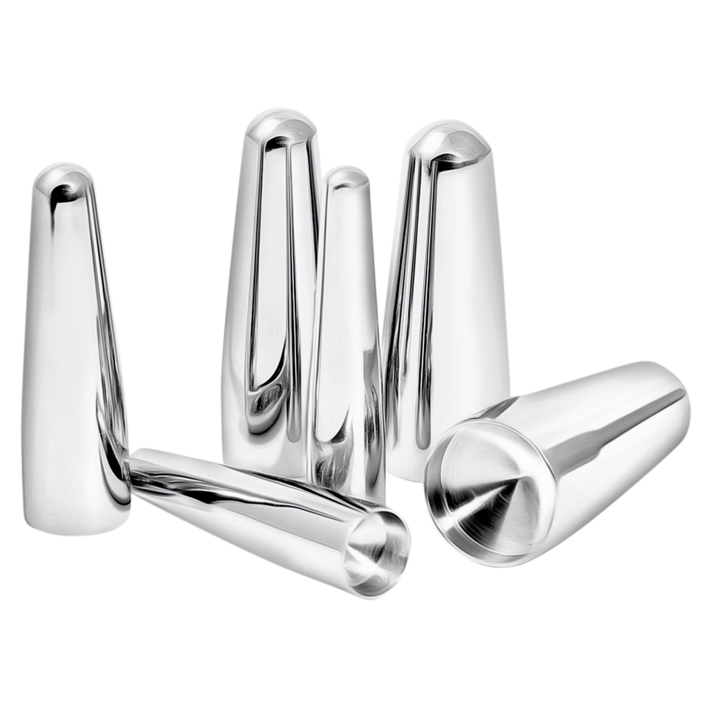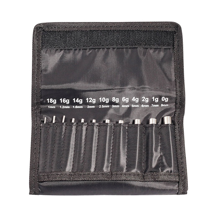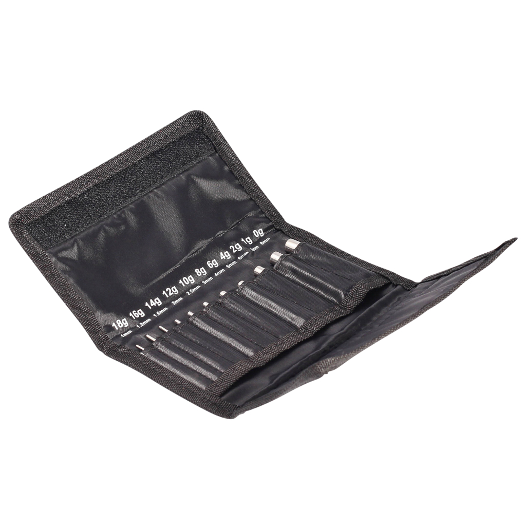 Im kleinen Set erhältst du Dehner, die von 1mm bis 8 mm reichen. Das große Set geht weiter, wo das kleine aufhört und geht somit von 10 mm bis 20 mm. Allen Dehnern ist gemeinsam, dass sie am hinteren Ende, also am dicken Ende, ein Loch haben welches der Größe eines Schmuckstückes entspricht. So ist der 10 mm Dehner eigentlich 11 mm groß. Das Schmuckstück führst du in die hohle Rückseite des Dehners ein und schiebst dann den Dehner durch dein Ohr, so hast du gleichzeitig einen Dehner und ein Schmuckstück. Mit anderen Worten, die Messgrößen sind innenseitige Messgrößen