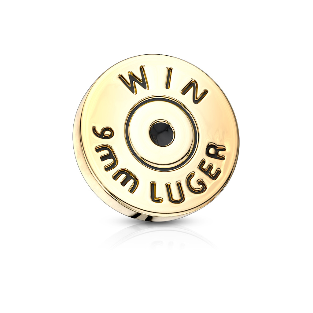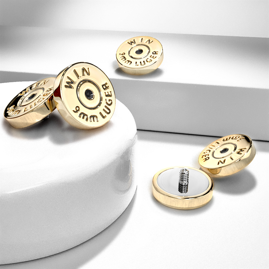 Der Schmuck besteht aus Chirurgenstahl, damit ist der Teil gemeint, der in deine Base eingeführt wird und Kontakt mit der Haut hat. Die Patrone besteht aus Messing und ist mit einer Goldfarbe beschichtet, um der Optik einer richtigen Patrone zu entsprechen. Der Schmuck misst etwa 7 mm im Durchmesser - somit gibt es auch genug Platz für den eingravierten Text, den du auf dem Bild weiter oben sehen kannst.
