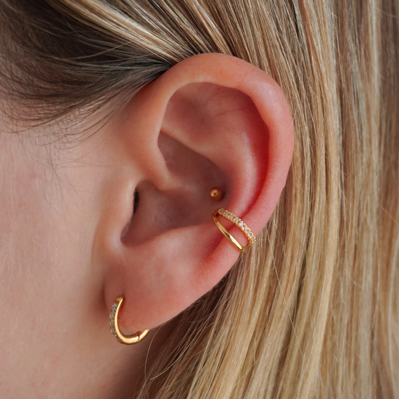 Der doppelte Ear Cuff mit Zirkoniasteinen bringt mehr Details ins Spiel, ganz ohne Piercing. Er sitzt eng am Ohr und sieht aus wie zwei Piercings, bleibt dabei aber komfortabel genug fürs tägliche Tragen. Kleine Zirkoniasteine sind in einer feinen Krappenfassung gesetzt und sorgen für genau das richtige Funkeln. Erhältlich in den Farben Gold und Silber.