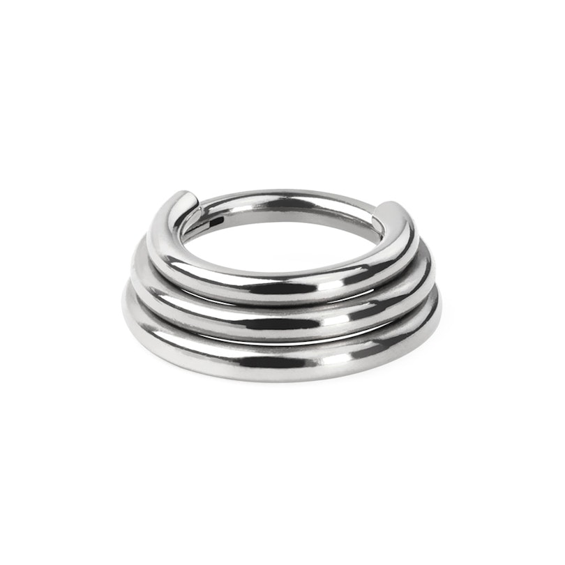 Obwohl dieses Schmuckstück als dreilagiger Ring bezeichnet wird, sind tatsächlich 3 einzelne Ringe miteinander verschweißt. Es ist jedoch nur der Ring in der Mitte, der normal ist. Bei den anderen beiden Ringen wurde ein Teil entfernt, sodass nur ein Ring durch dein Piercing geht.