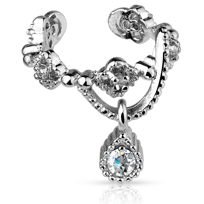 Es gibt nicht viele Earcuffs, die auch einen Anhänger haben und somit bekommst du hier schon fast ein einzigartiges Schmuckstück. Der Anhänger ist tropfenförmig gehalten und sieht fast so aus, als wenn ein funkelnder Tropfen von deinem Ohr kullert, da der eingearbeitete Stein im Licht glitzert und glimmert. Der Stein hat den weltbekannten Facettenschliff erhalten - auch bekannt als Diamantschliff", so daß sich das Licht in den vielen geraden Flächen bricht und dadurch wie ein Sternenhimmel funkelt.