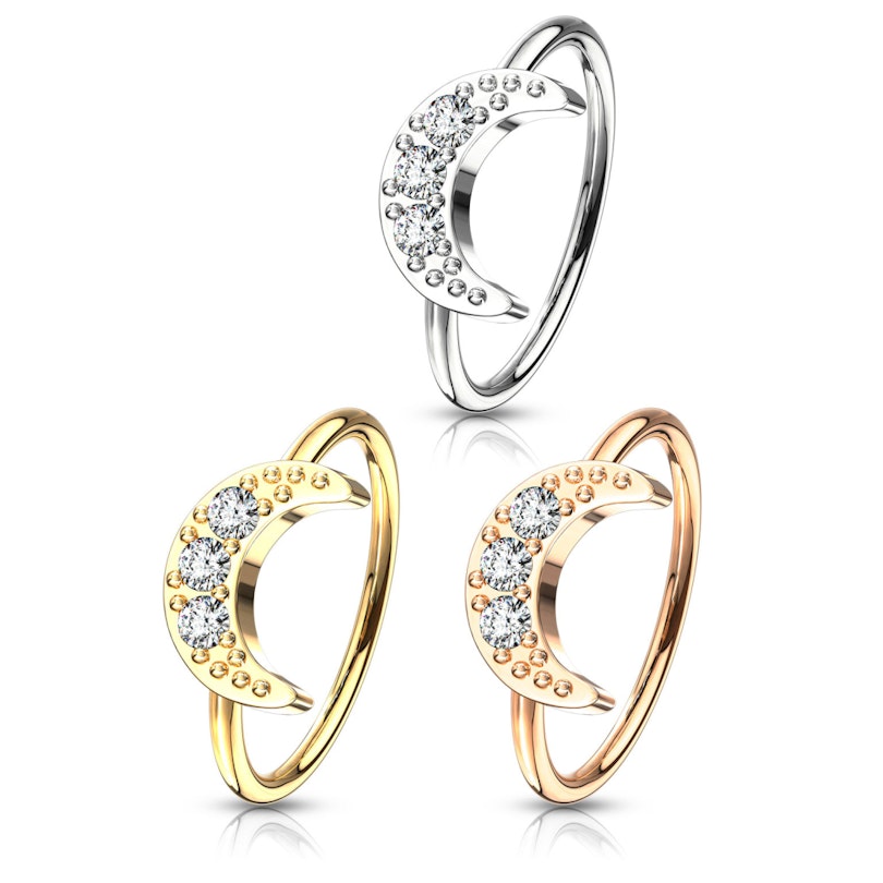 Endloser Ring aus Chirurgenstahl mit einer Mondsichel. Der Mond ist mit drei klaren Steinen in der Mitte verziert, die von kleinen Nieten umgeben sind.