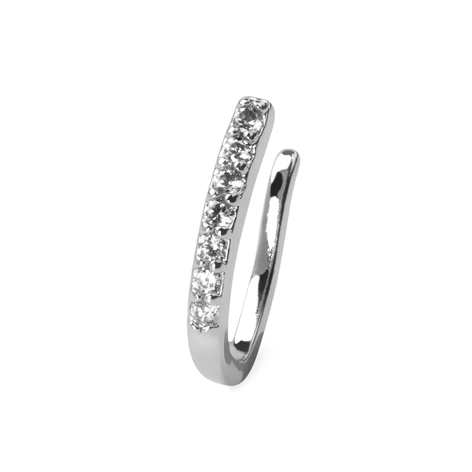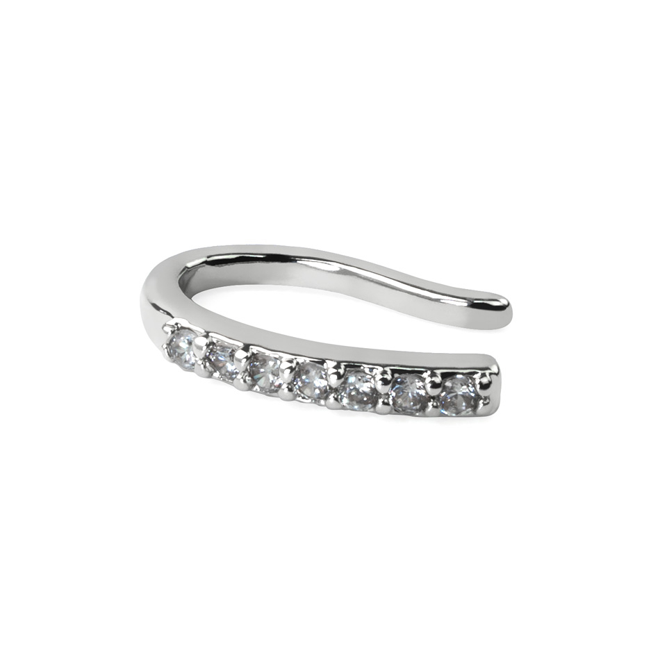 Der Schmuck ist ca. 1 mm dick und ist, wie du auf dem Bild sehen kannst, mit einer Reihe von sieben klaren Steinen besetzt. Da es sich hier um Fake Piercingschmuck handelt, welcher nicht durch die Haut geht, besteht der gesamte Schmuck aus Messing, welches beschichtet wurde, um dem Schmuck eine schöne glänzende Oberfläche zu verleihen.