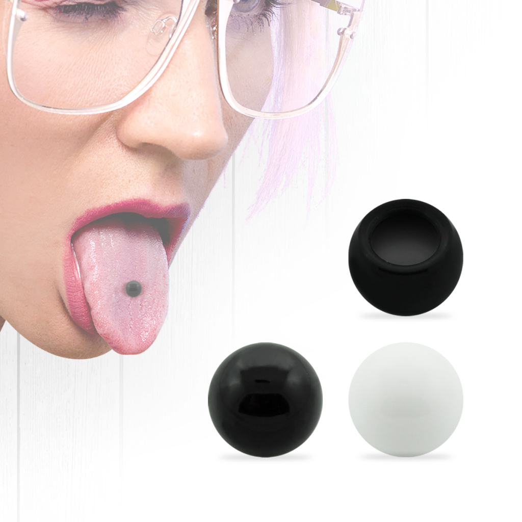 Auf dem Bild oben siehst du ein Fake Zungenpiercing. Das bedeutet, dass du kein Loch in der Zunge benötigst, um es zu tragen. Mit diesem Zungenpiercing kannst du sowohl fühlen, als auch sehen, wie es ist, ein Zungenpiercing zu haben, bevor du dir ein Piercingloch machen lässt. Dieses Fake Zungenpiercing ist in zwei Farben erhältlich, in schwarz und weiß. Die Kugel besteht aus Acryl, wo auf der einen Seite ein Hohlraum ist. Dieser Hohlraum ermöglicht die Entstehung eines Vakuums, wenn du Luft aus der Kugel saugst und somit einen Unterdruck erzeugst. So kann die Kugel fest auf der Zunge haften.