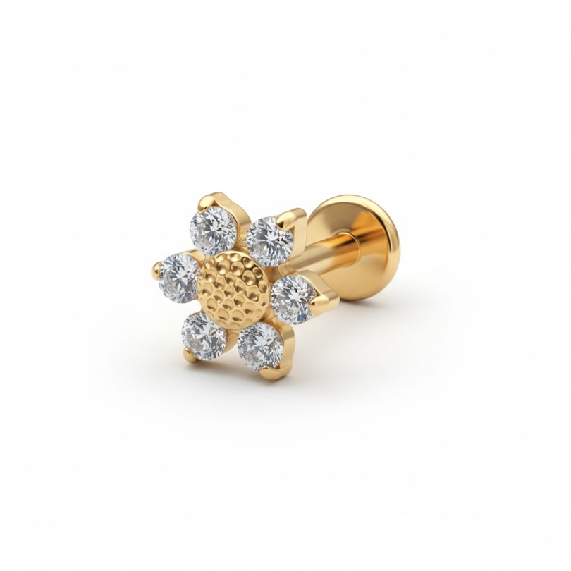 Das Gänseblümchen-Labret aus Titan erinnert dich daran, dass nicht jeder Tag ernst sein muss. Mit seinem blütenförmigen Design aus eingefassten Schmucksteinen und einer feinen Mittelstruktur, erhältlich in Gold oder Silber, bringt es einen Hauch verspielte Leichtigkeit in deinen Look.