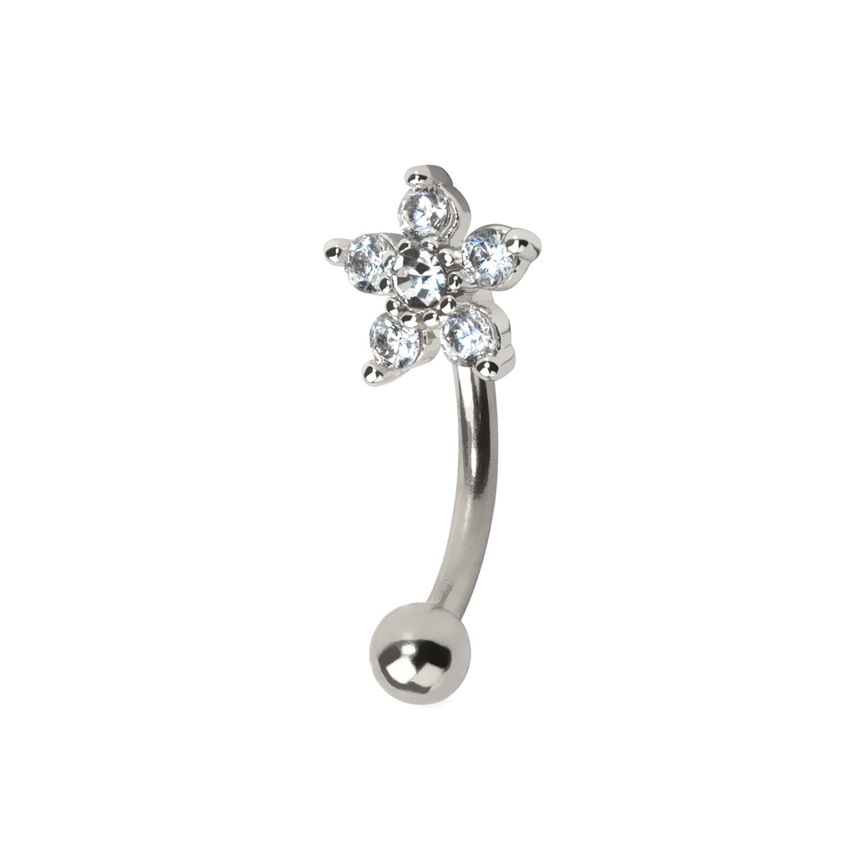 Der Schmuck besteht aus Chirurgenstahl, d.h. der Stab des Schmucks besteht aus Chirurgenstahl. An der Spitze des Schmucks sitzt eine niedliche kleine Blume aus Steinen - die Blume sitzt auf einer Platte aus Messing. Der komplette Schmuck wurde beschichtet, durch die Beschichtung passen die Teile optisch zusammen - die Kombination aus einem blanken Stab und einer messinggelben Blume mit Steinen würde auch etwas merkwürdig aussehen. Die Beschichtung gibt dir auch die Möglichkeit aus mehreren Farben auszuwählen - unter anderem Gold und Rotgold.