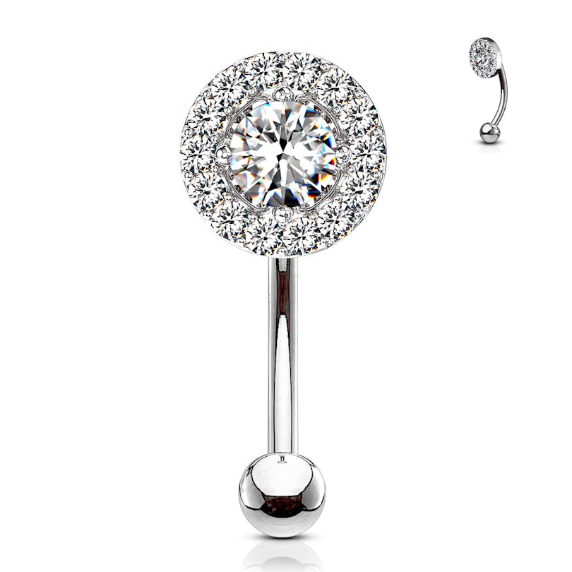 Mit diesem gebogenen Stab erhältst du ein Schmuckstück, welches durch seinem großen funkelnden Mittelstein schön auffällig ist. Der Stein sitzt auf einer runden Platte aus Messing, die beschichtet wurde, um mit dem Stab farblich übereinzustimmen. Die Farbe des Mittelsteins kannst du selbst auswählen, beispielsweise steht ein türkiser Stein zur Auswahl. Der Mittelstein ist von vielen kleinen Steinen umgeben, diese kommen unabhängig von der gewählten Farbe immer in einer klaren Version.