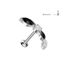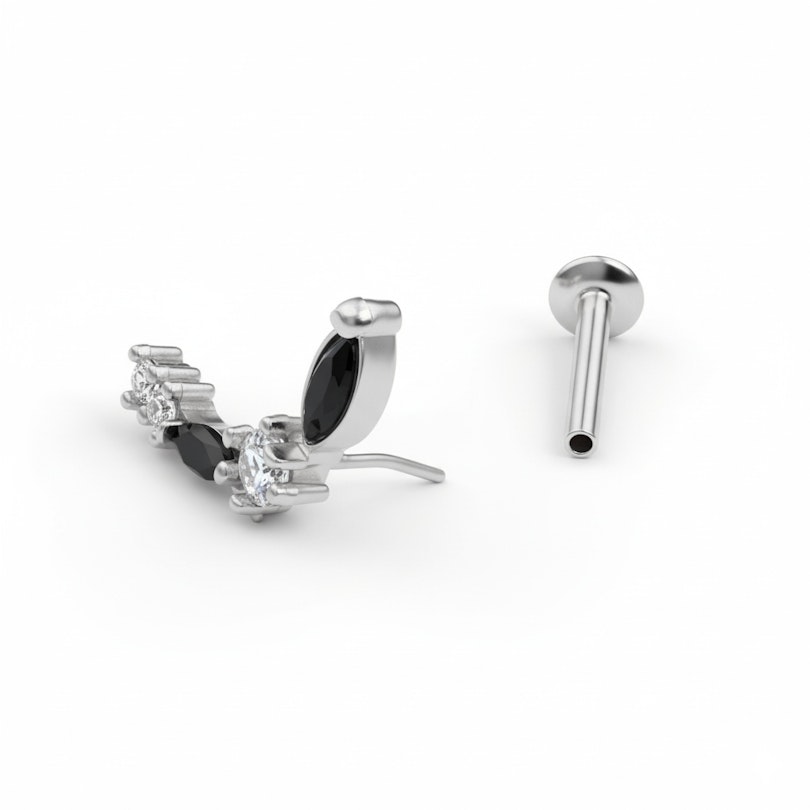Der gebogene Stab mit schwarzen und klaren Schmucksteinen setzt auf spannende Gegensätze. Vier gefasste Steine, abwechselnd schwarz und klar, folgen einer sanften Kurve, die Aufmerksamkeit weckt, aber subtil bleibt.