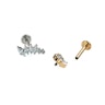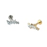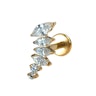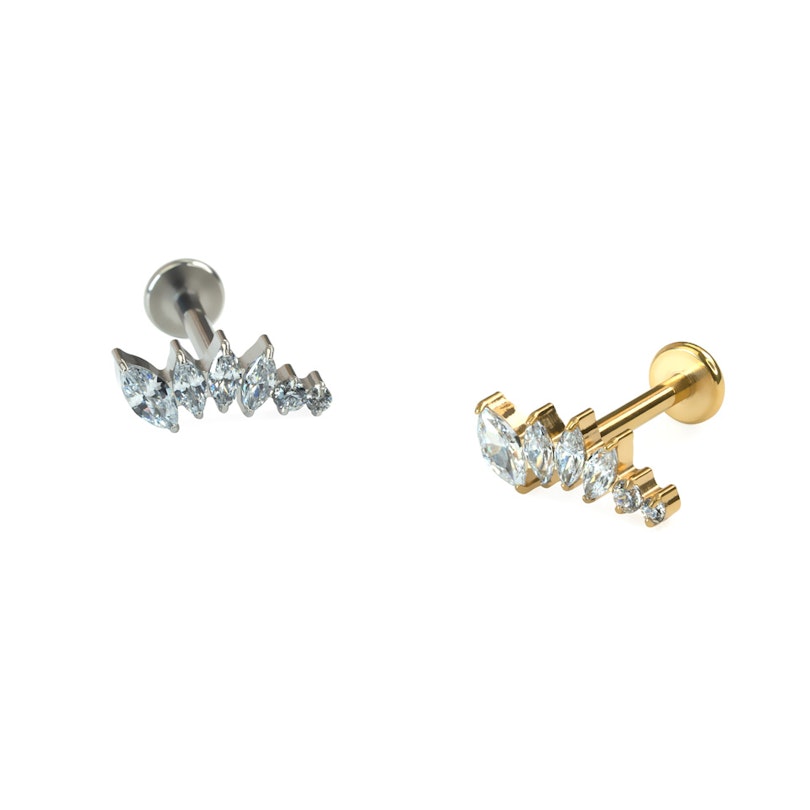 Dieses Labret weist CZ-Steine im Marquiseschliff in abnehmender Grösse auf, die in einer sanften Kurve angeordnet sind. Es eignet sich ideal für ein Helix-, Flach- oder Oberlappenpiercing, wo die Kurve der Kontur des Ohres folgt. Das Stück wird mit einem Innengewinde verschlossen, d. h., zum Tragen wird der glatte Stiel durch das Piercing gesteckt und das Oberteil aufgeschraubt, um es zu sichern. Da es aus Titan gefertigt ist, ist es auch für Menschen mit empfindlicher Haut geeignet.