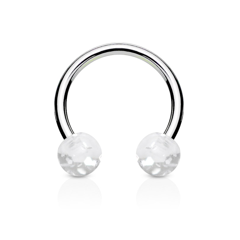 Das Hufeisen ist mit zwei Acrylkugeln versehen, die zu der Kugel passend, gleichfarbige Glimmerpartikel enthalten. Diese Glimmerpartikel verleihen jedem Schmuckstück ein absolut einzigartiges Aussehen, denn kein Schmuckstück gleicht exakt dem anderen.