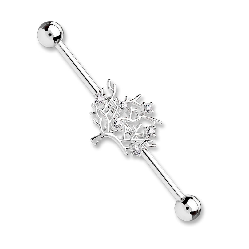 Der Stab besteht aus Chirurgenstahl und ist in drei verschiedenen Farben erhältlich. Die Farbe ist auch der einzige Unterschied zwischen diesen drei schönen Modellen, denn die Form und die Steinchen sind bei allen gleich. Der Baum selbst, besteht aus Messing und hat anschließend eine Farbbeschichtung erhalten, die dem Stab angepasst ist.
