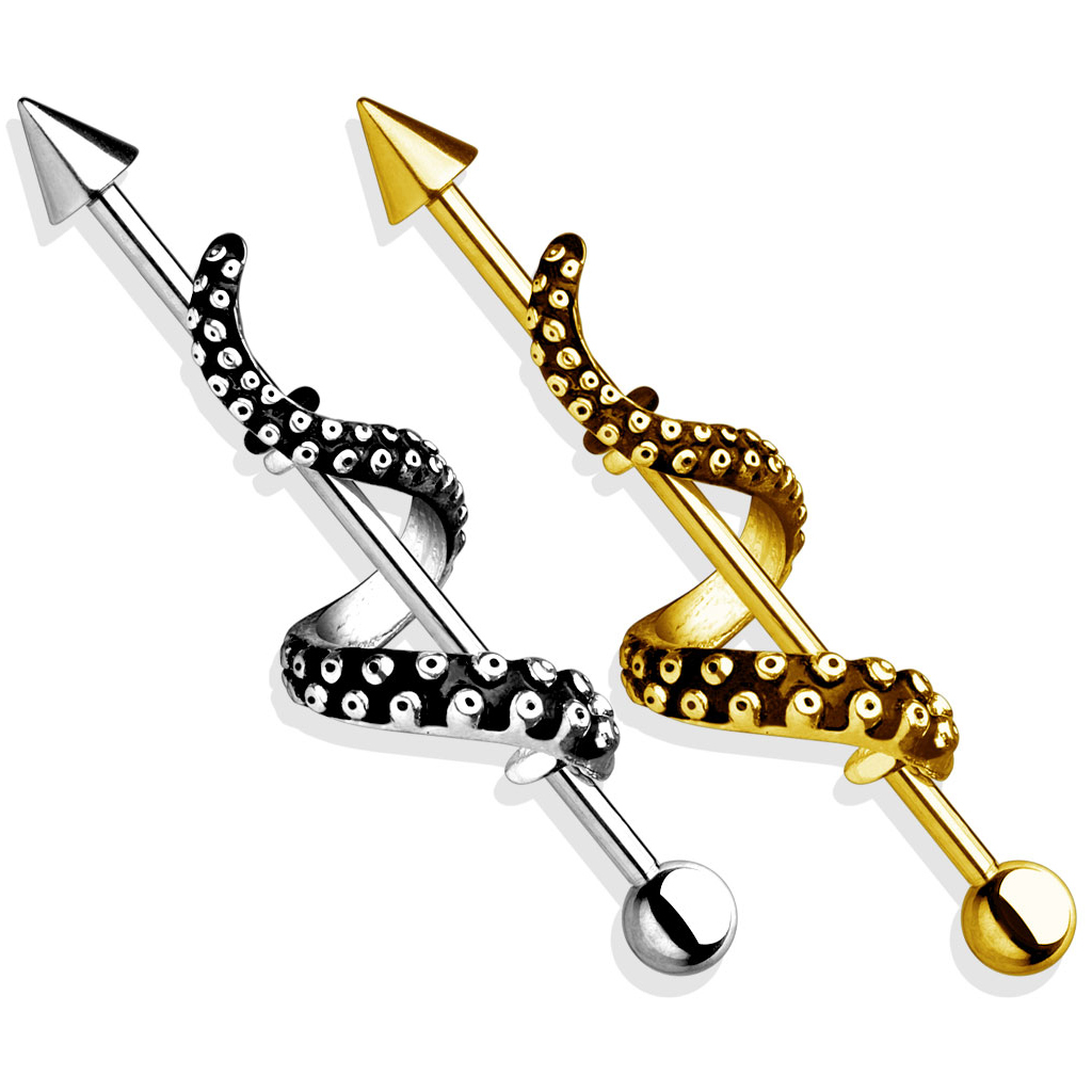 Wenn du auf der Suche nach etwas ganz Besonderen für dein Industrial Piercing bist, dann bist du hier an der richtigen Stelle! Dieser super coole Industrialstab ist wie ein Pfeil geformt und hat eine Kugel an dem einen Ende und einen Spike am anderen Ende des Stabes. Jedoch ist es das mittlere Stück, welches jedes Interesse auf sich zieht. Denn zwischen den beiden Enden befindet sich eine Tentakel, die lebensecht einer echten Oktopusstentakel gleicht, da sie auch mit den kleinen Saugnäpfen versehen wurde.
