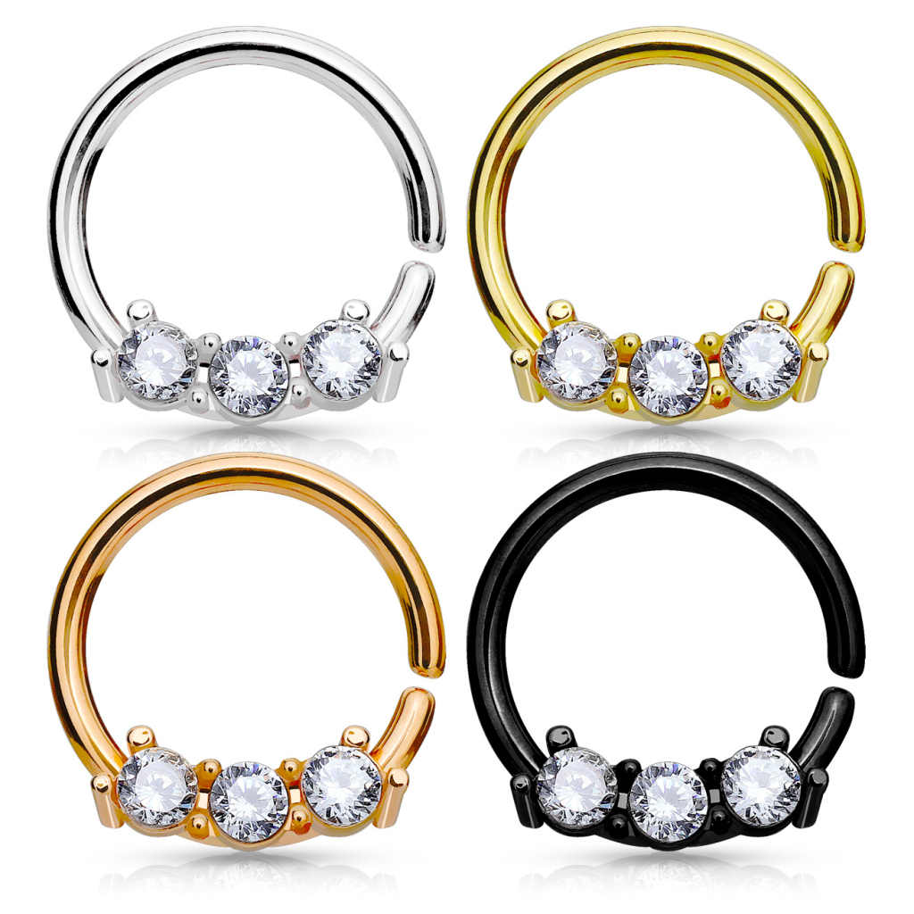 Schmuck für Septumpiercings ist meistens groß und auffällig, es sei denn man nimmt einen schlichten Kugel- oder Segmentring. Sobald aber Steine mit ins Spiel kommen, wird der Schmuck groß und voluminös. Aber nicht bei diesem schönen Septumschmuck, mit den schlanken Design und der drei kleinen Steinchen auf dem schmalen Ring.
