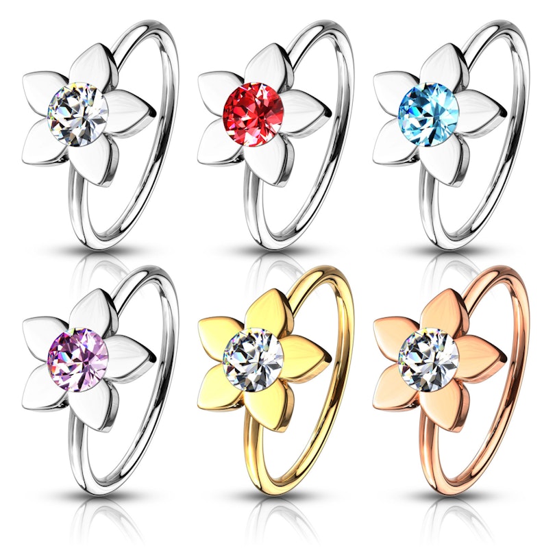Der Schmuck, den du hier betrachten kannst, ist ein Nasenring mit einer Lotusblume auf der Vorderseite. In der Lotusblume befindet sich ein runder Stein, dessen Farbe du frei wählen kannst. Zum Beispiel kannst du einen rosa oder roten Stein wählen. Darüber hinaus kannst du auch die Farbe des Schmucks selbst auswählen - wähle unter anderem zwischen einer goldenen und blanken Variante des Schmucks. So hast du die Möglichkeit, die für dich beste Variante des Schmucks zusammenzustellen. Jedoch ist zu erwähnen, dass der Stein der Gold und Rotgold Variante nur in der klaren Version verfügbar ist. Der gesamte Schmuck besteht aus Chirurgenstahl, die Gold und Rotgold Versionen wurden mit einer Farbbeschichtung überzogen. Die Beschichtung hierbei ist eine Ionenbeschichtung, was bedeutet, dass sich die Beschichtung nicht ablöst - obwohl sie mit der Zeit dennoch leicht abnutzen kann. Wenn du also einen Schmuck mit langer Haltbarkeit der Beschichtung haben möchtest, dann bist du hier genau richtig.
