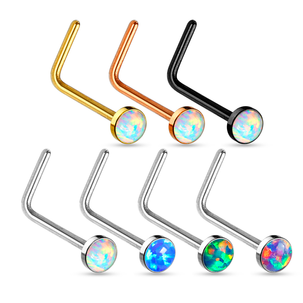 Schöner Nasenschmuck, dessen Farbe du selber wählen kannst. Wir haben dieses Modell in den Farben Blank, Gold, Rotgold und Schwarz auf Lager. Egal für welche dieser Farben du dich entscheidest, haben alle einen schönen synthetischen Opalstein an der Spitze. Das wirkt glamourös, schön und edel. Alle Materialfarben haben einen weißen Opal an der Spitze, jedoch bei dem blanken Modell können wir auch noch die Farben Blau, Grün und Lila anbieten. Also je nach deinem eigenen Temperament findest du hier die passende Farbe dazu.
