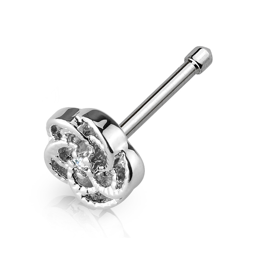 Dieser süße Nasenstecker besteht aus einem graden Stab und einer schönen Rose auf der Vorderseite. Die Rose ist sehr detailliert gestaltet, mit überlappenden Blättern, die ein wenig die Struktur von kleinen Knospen haben. In der Mitte der Rose ist ein kleiner Stein angebracht, der perfekt zum spiegelblanken Design passt.