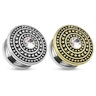 Das Schild kannst du entweder in blanker oder goldfarbener Ausgabe bekommen. Hier siehst du nicht nur markante Rillen, sondern auch ein rustikales Kugelmuster zwischen den Ringen. Es sieht fast so aus, als wenn hier kleine Steinchen befestigt wurden und das entlängs der gesamten Kante.