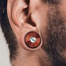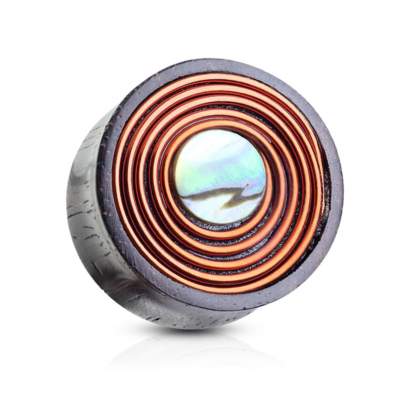 Organische Materialien eignen sich hervorragend für heilende Piercings, da sie durch das Atmen des Materials den Geruch reduzieren können. Da organische Materialien kein Nickel enthalten, eignet sich dieser Plug auch für Allergiker. Der Nachteil dieser Materialien ist jedoch, dass sie etwas empfindlicher gegenüber Feuchtigkeit und übermäßiger Hitze sind, da sie durch diese ihre Form verlieren können. Der Schmuck benötigt somit etwas mehr Pflege, dafür erhältst du hier aber einen unglaublich schönen Plug, der auch gut für dich ist. Dieser Plug hier besteht also aus einem organischem Material, nämlich Holz. Der Schmuck ist in den Größen von 10 bis zu 25 mm erhältlich. Somit ist es leider kein Schmuck für Anfänger - jedoch ist es etwas, auf das man sich freuen kann. Auf der Vorderseite des Plugs befindet sich in der Mitte eine kleine Perlmuttplatte, die von einem Kupferdraht umgeben ist. Wenn man dies liest klingt es erst ein bisschen seltsam, wenn man den Schmuck selbst noch nicht gesehen hat - aber diese Kombination passt unglaublich gut zu diesem Plug.