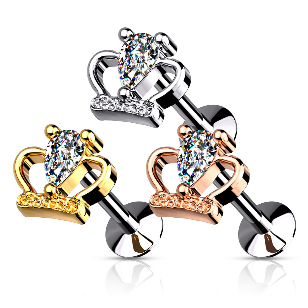 Dieses Labret hat eine schöne Krone auf der Vorderseite. Die Krone ist in verschiedenen Farben erhältlich. Alle Modelle haben die gleiche Länge, Dicke und Steinfarbe. Die Krone hat einen schönen umgedrehten, tropfenförmigen, klaren Stein in der Mitte. Auf der Rückseite der Krone befindet sich ein kleiner Stift, der in das Barbell geschoben wird. Es gibt also kein Gewinde, das aufgeschraubt werden muss. Wenn du denkst, dass die Krone zu leicht herauszunehmen ist, kannst du dem Stift eine kleine Biegung geben, damit er besser in die Schnalle unten im Barbell selbst passt.