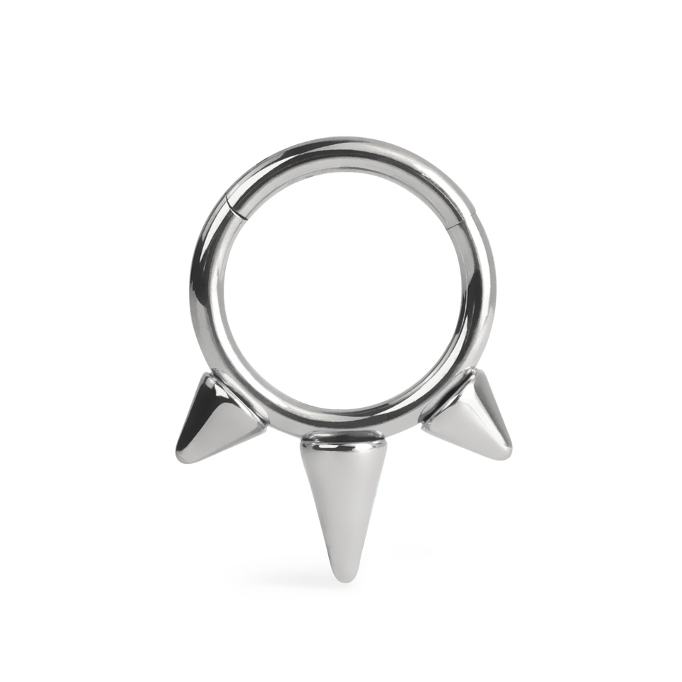 Zusätzlich zu allem, was oben erwähnt wurde, sieht der Schmuck super trendy aus, da er mit 3 Spikes verziert ist. Die mittlere Verzierung hat die Grösse von 5 mm (3/16 ") und die beiden seitlichen Spitzen 3,4 mm (0,13").