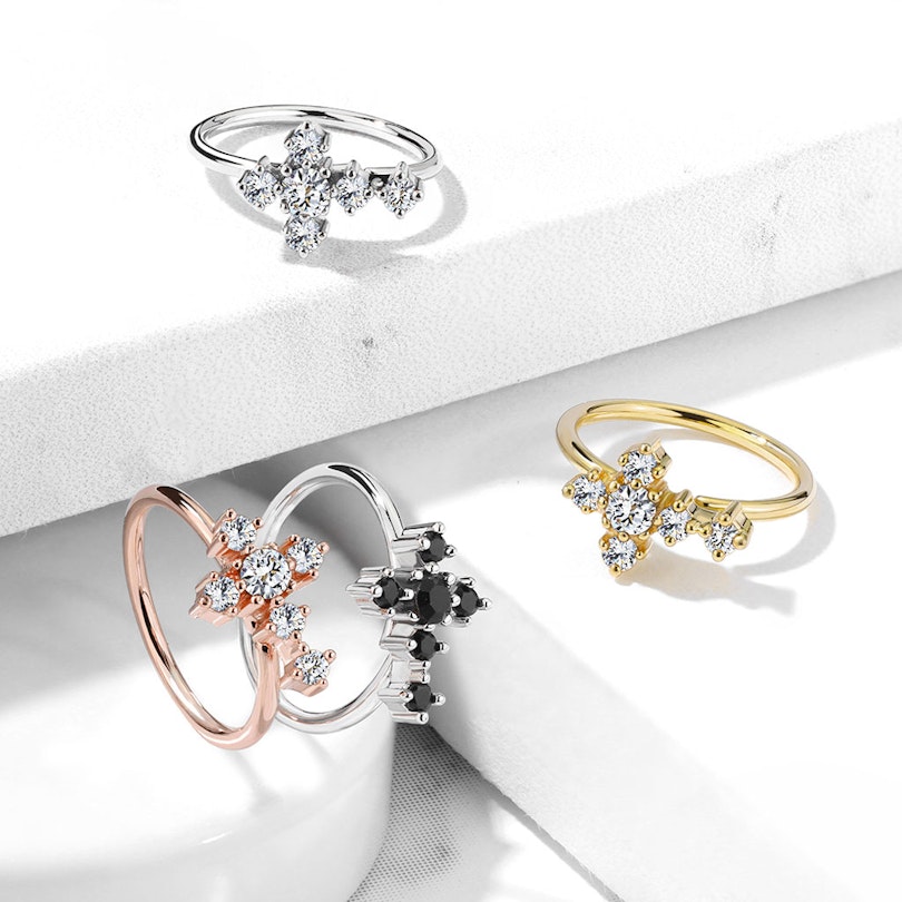 Der Schmuck besteht aus Messing und misst 0,8 mm in der Stabstärke und 8 mm im Durchmesser. Die blanke Version wurde mit Platin und die beiden Gold Versionen mit 14 Karat Gold beschichtet. Wie du bereits bemerkt hast, befindet sich auf der Vorderseite des Schmucks ein schönes Kreuz. Dieses Kreuz wurde mit sechs kleinen Steinen besetzt, dessen Farbe du auswählen kannst. Du kannst den Ring unter anderem mit klaren oder schwarzen Steinen erwerben.