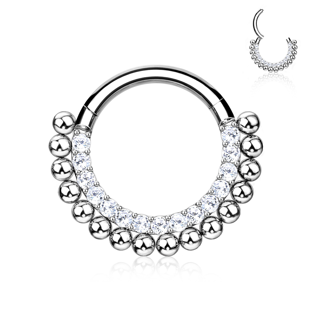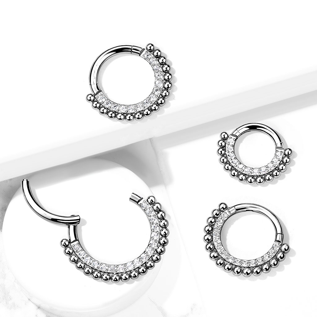 Titan ist eines der besten Materialien, die du deinem Piercing geben kannst. Aus diesem Grund wird Titan-Anfgangsschmuck für neue Piercings verwendet. Normalerweise ist Titanschmuck langweilig, d.h. er enthält keine Steine oder Ornamente. Das stimmt aber nicht bei diesem Schmuck, da es viele Steine und kleine runde Perlen um den Ring gibt.