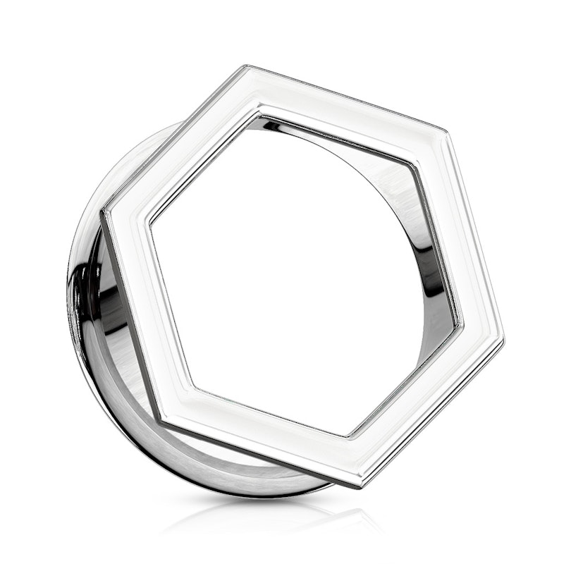 Dieser Tunnel mit einer Sechskant-Front besteht aus Chirugenstahl. Der Schmuck hat eine Erhebung hinten, daher wird dieser Tunnel auch als "Double Flared Tunnel" bezeichnet, was für eine gute Passform sorgt. Mit dieser Erhebung war es auch nicht notwendig, den Tunnel mit einem Schraubgewinde auszustatten. Es kann jedoch sein, dass sich das einführen des Schmucks als etwas schwieriger gestalten kann, der Tunnel muss nämlich durch das Dehnungsloch gedrückt werden - aber wie sagt man noch, Übung macht den Meister.