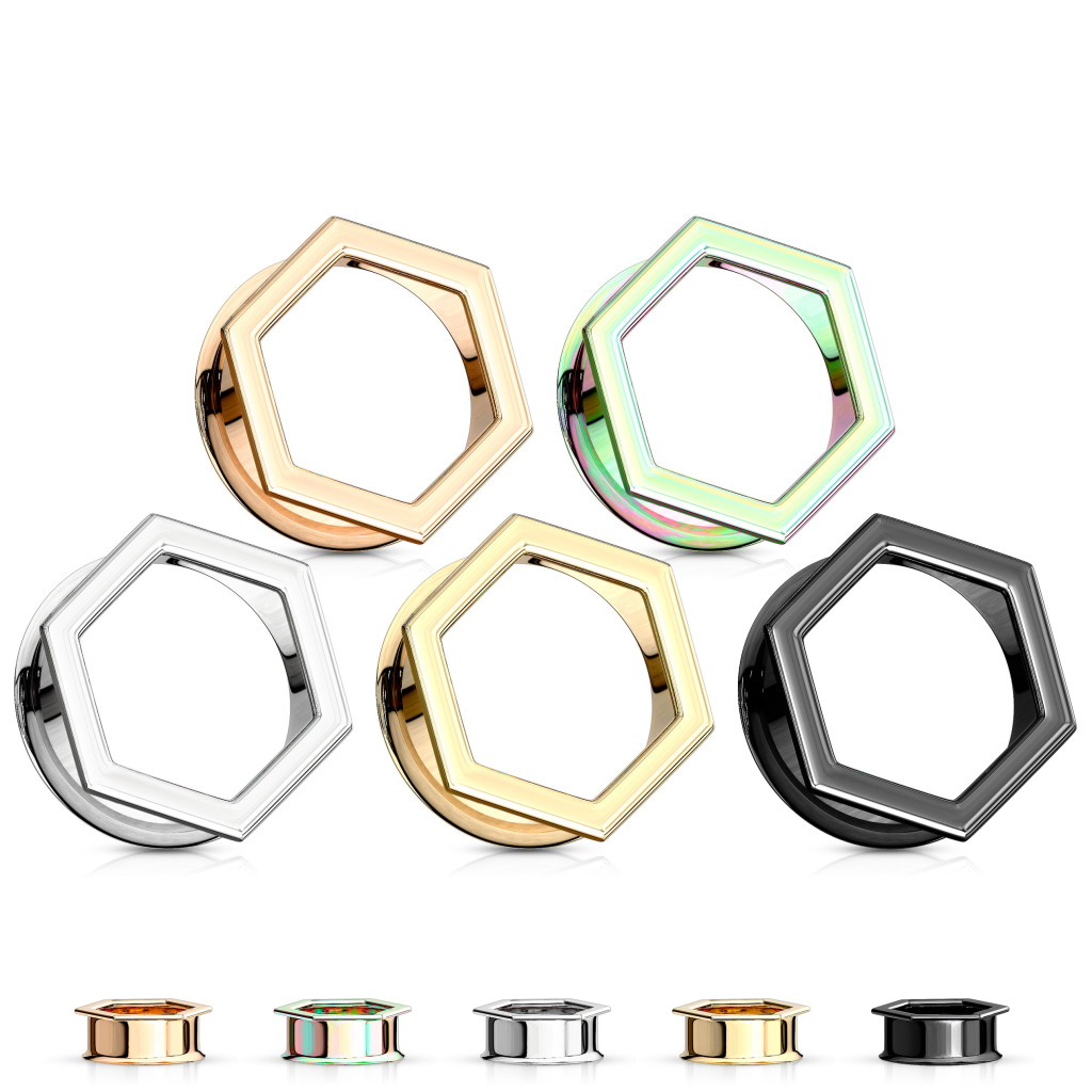 Dieser Tunnel mit einer Sechskant-Front besteht aus Chirugenstahl. Der Schmuck hat eine Erhebung hinten, daher wird dieser Tunnel auch als "Double Flared Tunnel" bezeichnet, was für eine gute Passform sorgt. Mit dieser Erhebung war es auch nicht notwendig, den Tunnel mit einem Schraubgewinde auszustatten. Es kann jedoch sein, dass sich das einführen des Schmucks als etwas schwieriger gestalten kann, der Tunnel muss nämlich durch das Dehnungsloch gedrückt werden - aber wie sagt man noch, Übung macht den Meister.