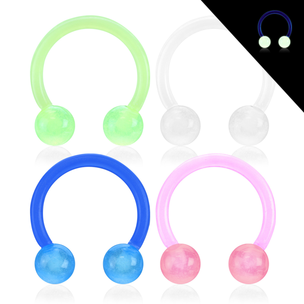 Wenn man das Licht ausschaltet, dann würde das Hufeisen auf dem obigen Bild aufleuchten. Hier sieht man nämlich ein selbstleuchtendes Hufeisen, das aus Acryl besteht. Bei Tageslicht schaut dieses Hufeisen in etwa wie ein gewöhnliches Hufeisen aus, aber sobald es dunkel wird, fängt das Hufeisen an zu leuchten. Das macht den Schmuck perfekt für Partys mit vielen Farben. Das Hufeisen kann an verschiedenen Körperstellen benutzt werden, je nachdem wo du gepierct bist - solange die Masse des Schmuckes mit den Massen deines Piercings übereinstimmen. Der Schmuck wird häufig für ein Septumpiercing, aber auch für Augenbrauen- und Ohrpiercings verwendet, die Wahl liegt also ganz bei dir.
