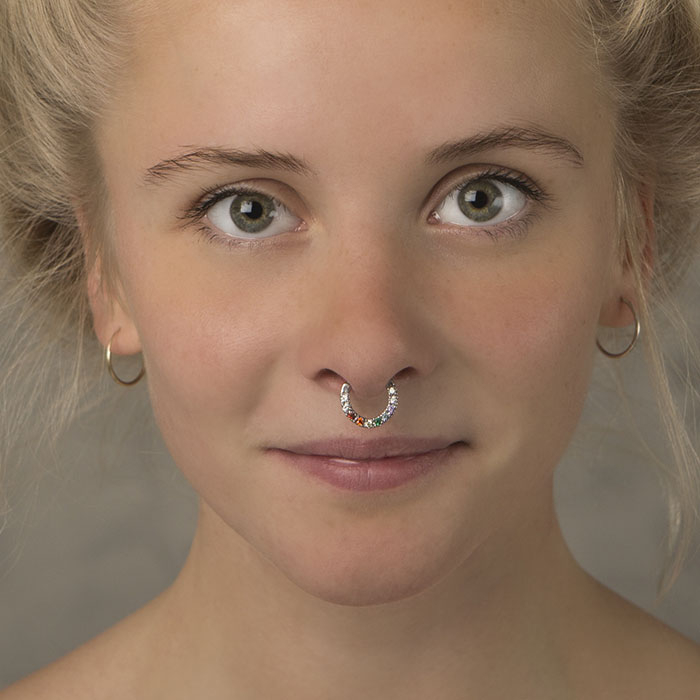 Hier haben wir ein wirklich tolles und elegantes Septumpiercing im klassischen und zeitlosen Stil. Der runde Zirkel wurde mit zehn wunderschönen Steinen versehen, die um die Wette glitzern und funkeln.