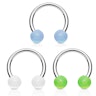 Super cooles Schmuckset mit drei Hufeiesen in verschiedenen, selbstleuchtenden Farben. Jedes Hufeisen ist aus chirurgischen Stahl hergestellt und mit Acrylkugeln an den Enden versehen, die im Dunkeln leuchten, wenn sie vorher unter der Lampe aufgeladen wurden. Die Hufeisen haben die Farben blau, grün und weiß.