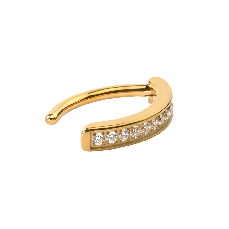 Dieser bezaubernde Bauchnabel-Clicker ist mit einer Reihe klarer Edelsteine versehen, die deinem Look einen glamourösen Touch verleihen. Die flache Wölbung dieses Bauchnabel-Clickers bedeutet, dass er näher am Körper sitzt als ein herkömmlicher Ring, was ihn wirklich praktisch macht. Er besteht aus implantierbarem Titan, ist also hypoallergen, leicht und langlebig.