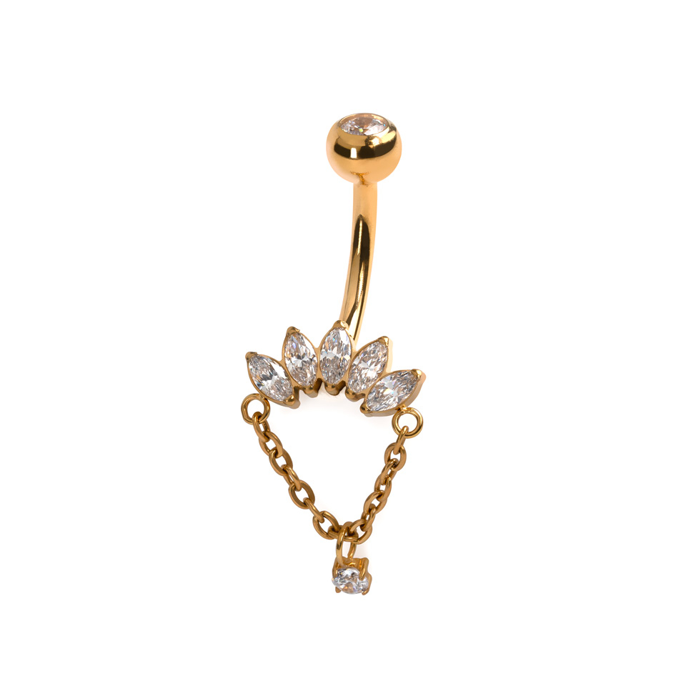 Dieser Titan-Bauchnabelring mit Steinen im Marquise-Schliff und einer Kette ist nicht einfach nur irgendein Titan-Stab. Er ist im Grunde ein Schmuckstück mit Persönlichkeit. Die Steine im Marquise-Schliff bilden eine kleine Krone, während die Kette genau das richtige Mass an Dramatik hinzufügt (denn auch dein Piercing verdient ein Spotlight).
