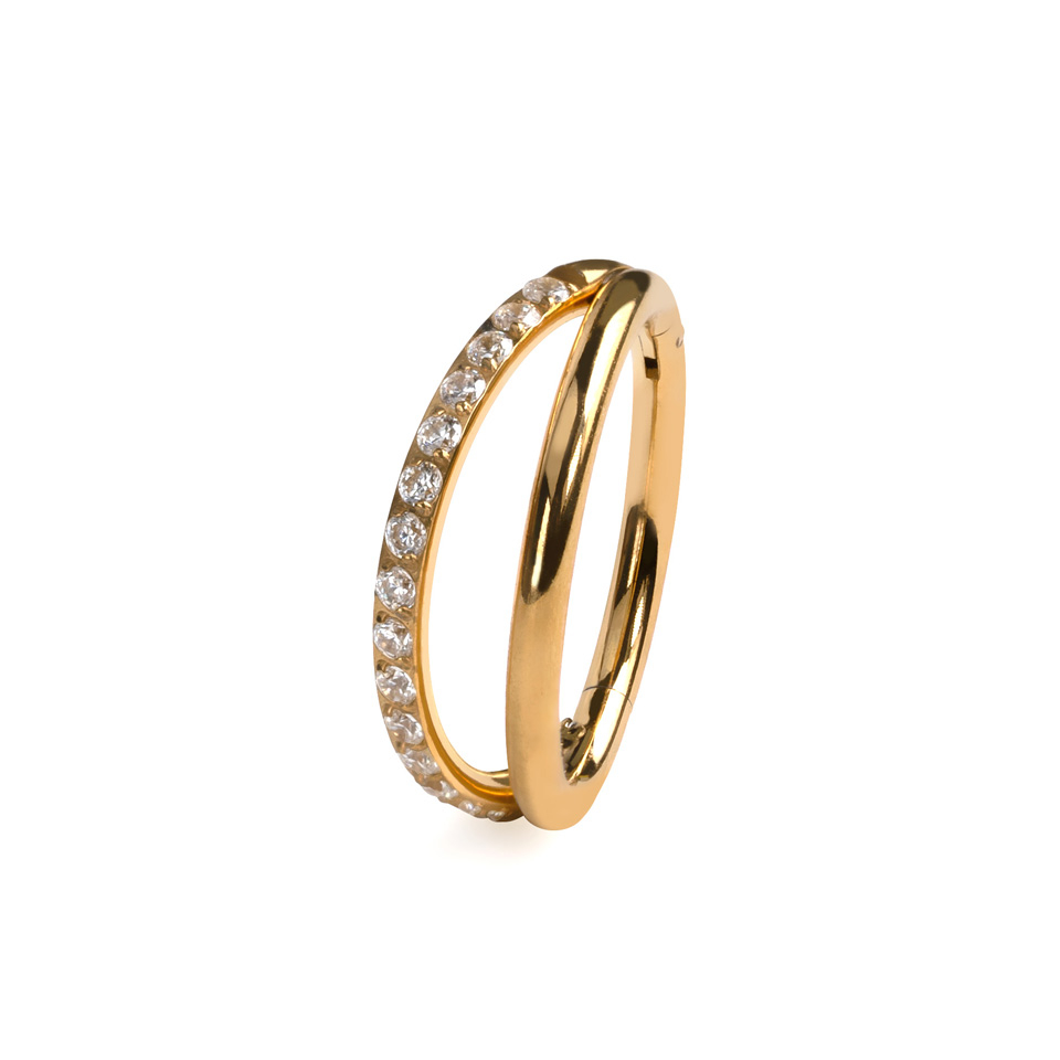 Dieser Doppelring aus Titan mit Schmucksteinen auf einem Band von Bodymod überzeugt durch sein gespaltenes Design: eine Hälfte glatt und minimalistisch, die andere mit Schmucksteinen besetzt. Zwei Stimmungen, ein Ring.