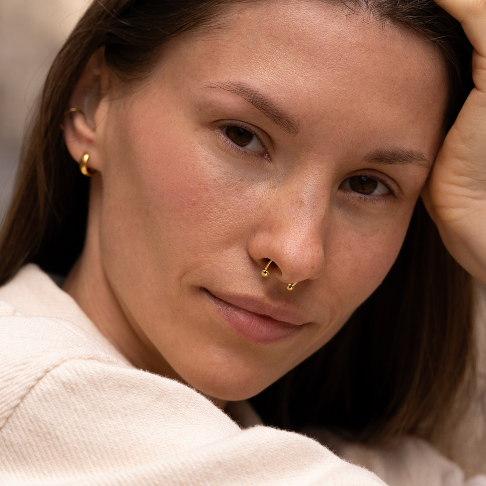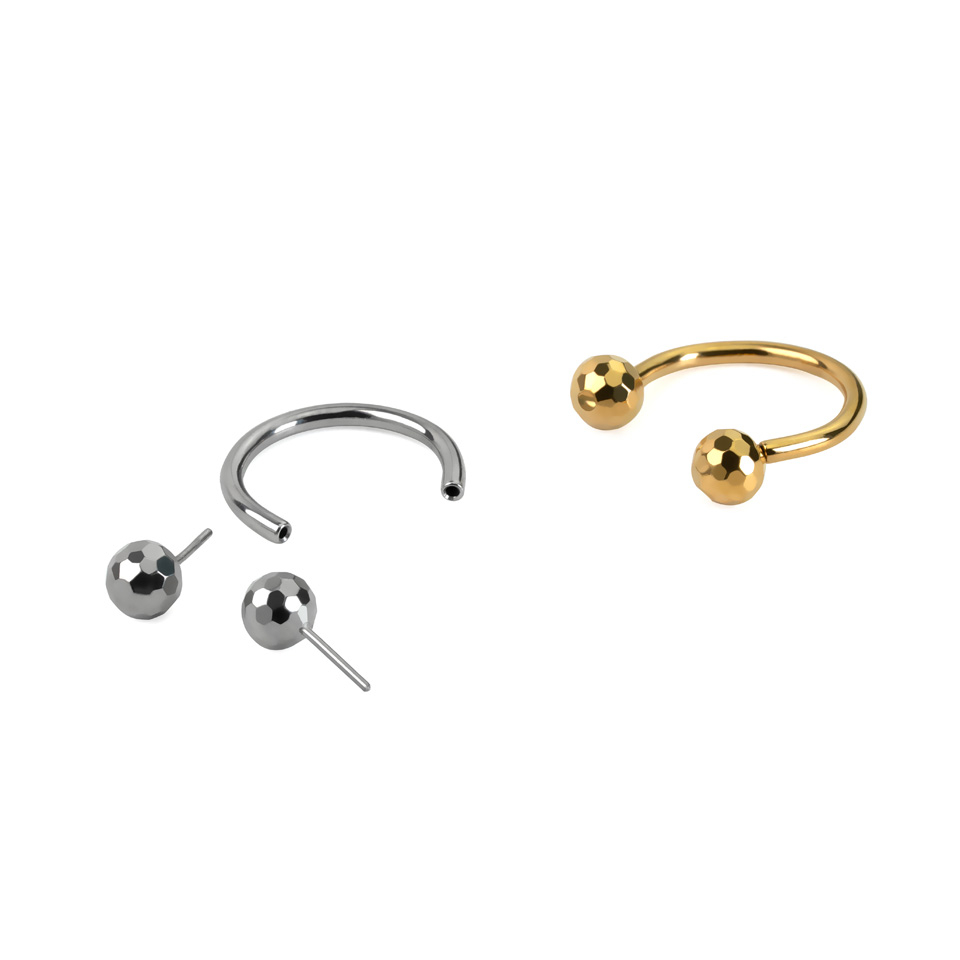 Dieses Titan Hufeisen ist gewindelos, das heisst, die Kugeln sind mit kleinen Stiften versehen, die in das Hufeisen gedrückt werden, um es in deinem Piercing zu befestigen. Die Kugeln sind facettenreich, was einen coolen, texturierten Look ergibt, der an Mini-Discokugeln erinnert. Dieser Schmuck eignet sich für verschiedene Piercings, darunter Augenbrauen-, Ohr- und Septum-Piercings, und ist in Gold- oder Silberausführung erhältlich.