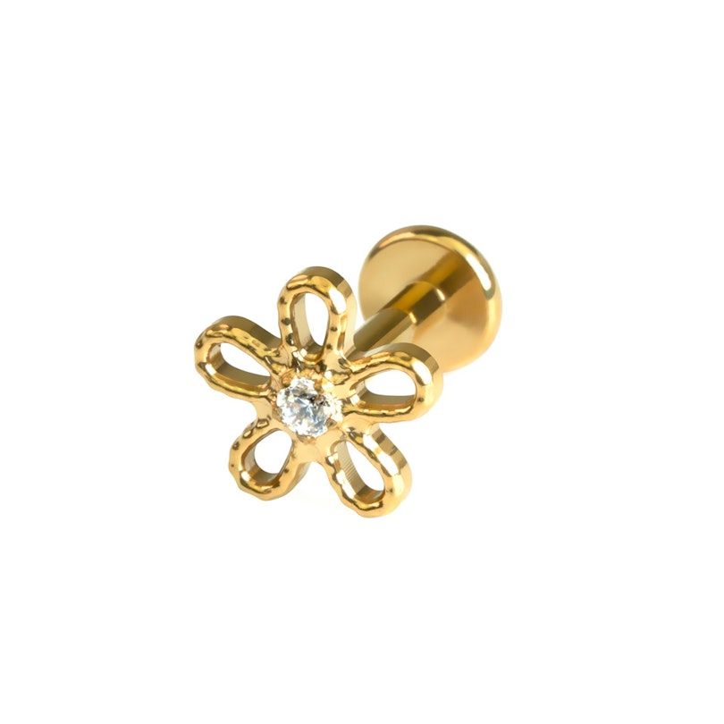 Das hübsche, gänseblümchenförmige Labret hat in der Mitte einen CZ-Stein, der etwas Glanz verleiht. Mit einem Innengewinde ist es leicht zu tragen - führe einfach den glatten Stab durch dein Piercing und drehe ihn oben, um ihn zu sichern. Da das Labret aus hypoallergenem Titan gefertigt ist, eignet es sich auch für empfindliche Haut. Es ist in Gold oder Silber erhältlich und lässt sich auch in seiner Länge passend zu deinem Piercing auswählen. Dieses Gänseblümchen-Design verleiht deinem Look einen hübschen Touch.