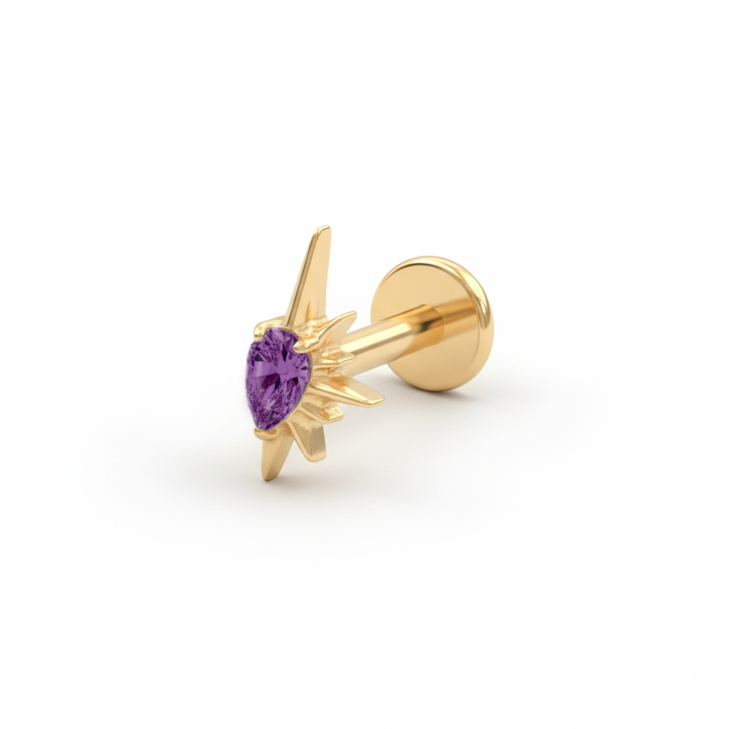 Das Labret aus Titan in Form einer halben Sonne zeigt, dass auch ein kleiner Stecker ganz gross rauskommen kann. Das halbsonnenförmige Design rahmt einen funkelnden Schmuckstein ein – erhältlich in klar oder violett.