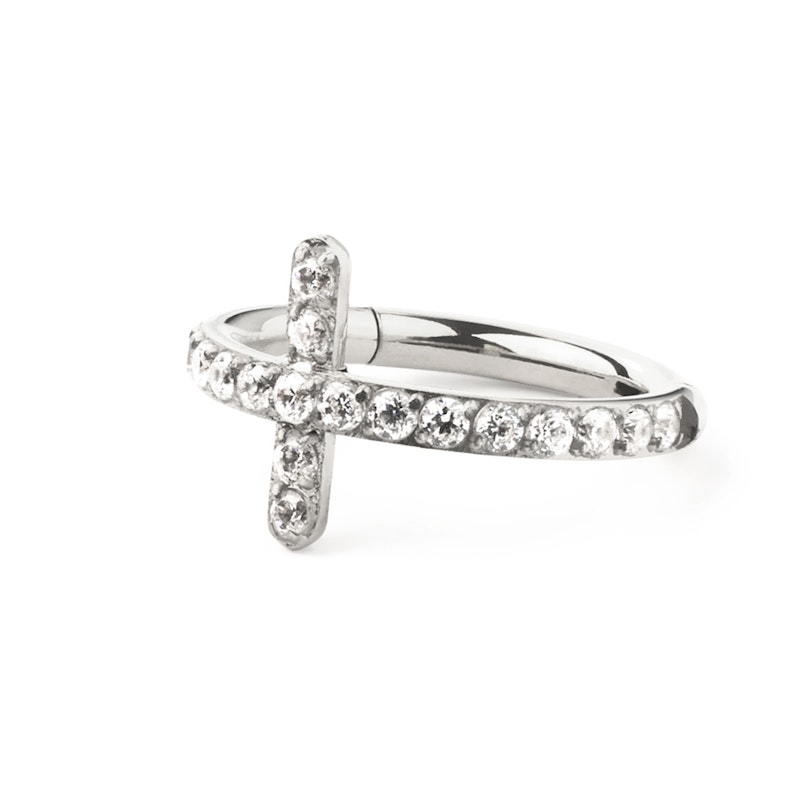 Die Vorderseite dieses schicken Titanrings bildet ein Kreuz, das mit winzigen Steinen verziert ist. Dank des Scharnierverschlusses lässt sich dieses Schmuckstück leicht in dein Piercing einsetzen. Titan ist hypoallergen und sehr widerstandsfähig, so dass dein Schmuck seinen Schein nicht verliert. Dieser vielseitige Schmuck ist in den Farben Gold und Silber und mit einem Durchmesser von 8 mm oder 10 mm erhältlich und kann in vielen verschiedenen Piercings getragen werden, unter anderem in Ohrläppchen, Helix und Tragus.
