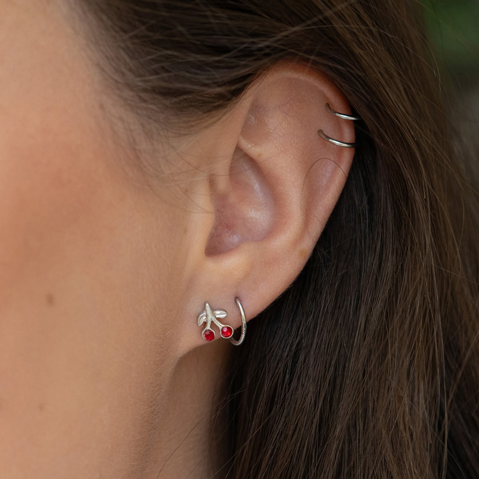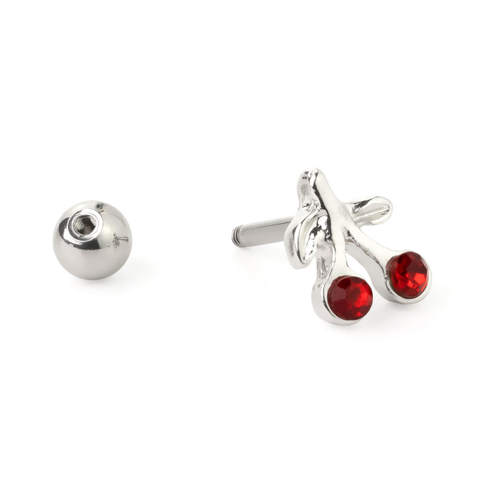 Die Vorderseite dieses Piercings wurde mit zwei süßen Kirschen geziert, die aus roten Steinen bestehen und auf der Rückseite ist eine typische, blanke Schließkugel.