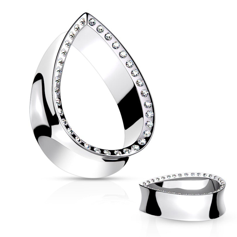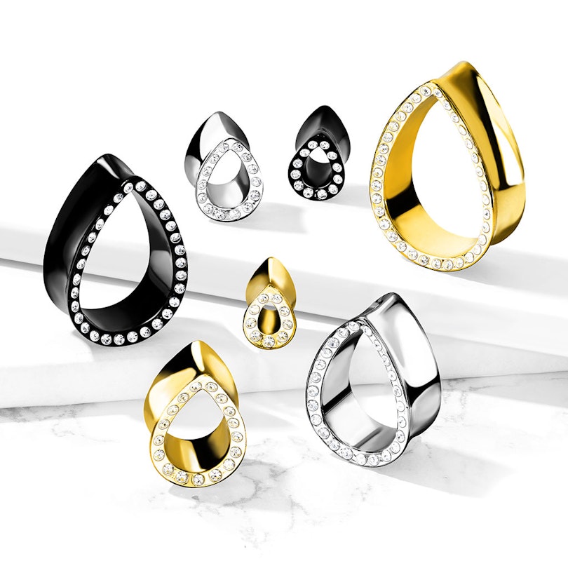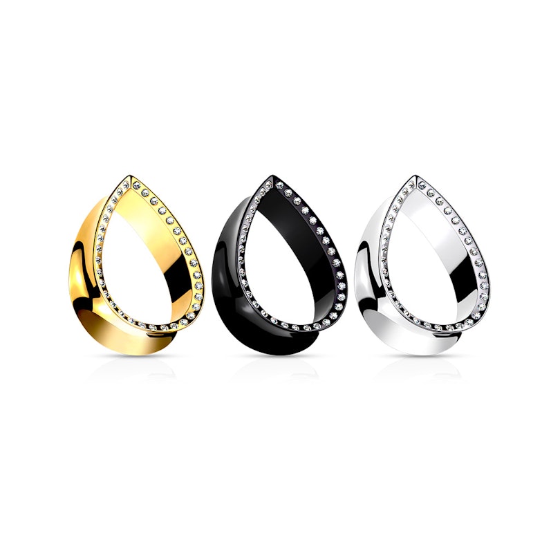 Die überwiegende Mehrheit des Tunnels ist rund. Dieser Tunnel ist tropfenförmig (oder birnenförmig). Er ist in drei schönen Farben erhältlich, die du auf dem Bild sehen kannst. Alle Modelle sind mit kleinen klaren Steinen am Rand versehen. Es ist klar, dass je größer der Durchmesser des Tunnels ist, desto mehr Steine befinden sich am Rand.