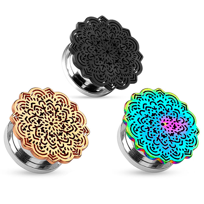 Hier bekommst du das schöne und besonders detaillierte Mandala in verschiedenen Farben, die dem Schmuck das gewisse Extra verleihen und das schöne Design umso schöner hevor heben. Wenn der Schmuck im Ohr sitzt, wird das farbige Mandala das einzige sein, was man von vorne sehen kann. Der eigentliche Tunnel ist nämlich aus blanken Chirurgenstahl hergestellt und hat ein praktisches Schraubgewinde erhalten.