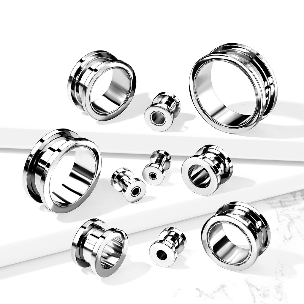 Der Tunnel wird, wie der Name auch andeutet, mit einem Schraubengewinde geliefert. Dies bedeutet, dass die Rückseite des Tunnels abgeschraubt werden kann, so dass es einfacher ist, den Tunnel einzusetzen oder rauszunehmen. Der Tunnel ist in Größen von 8 g (3 mm) bis 1 Zoll (25 mm) erhältlich.
